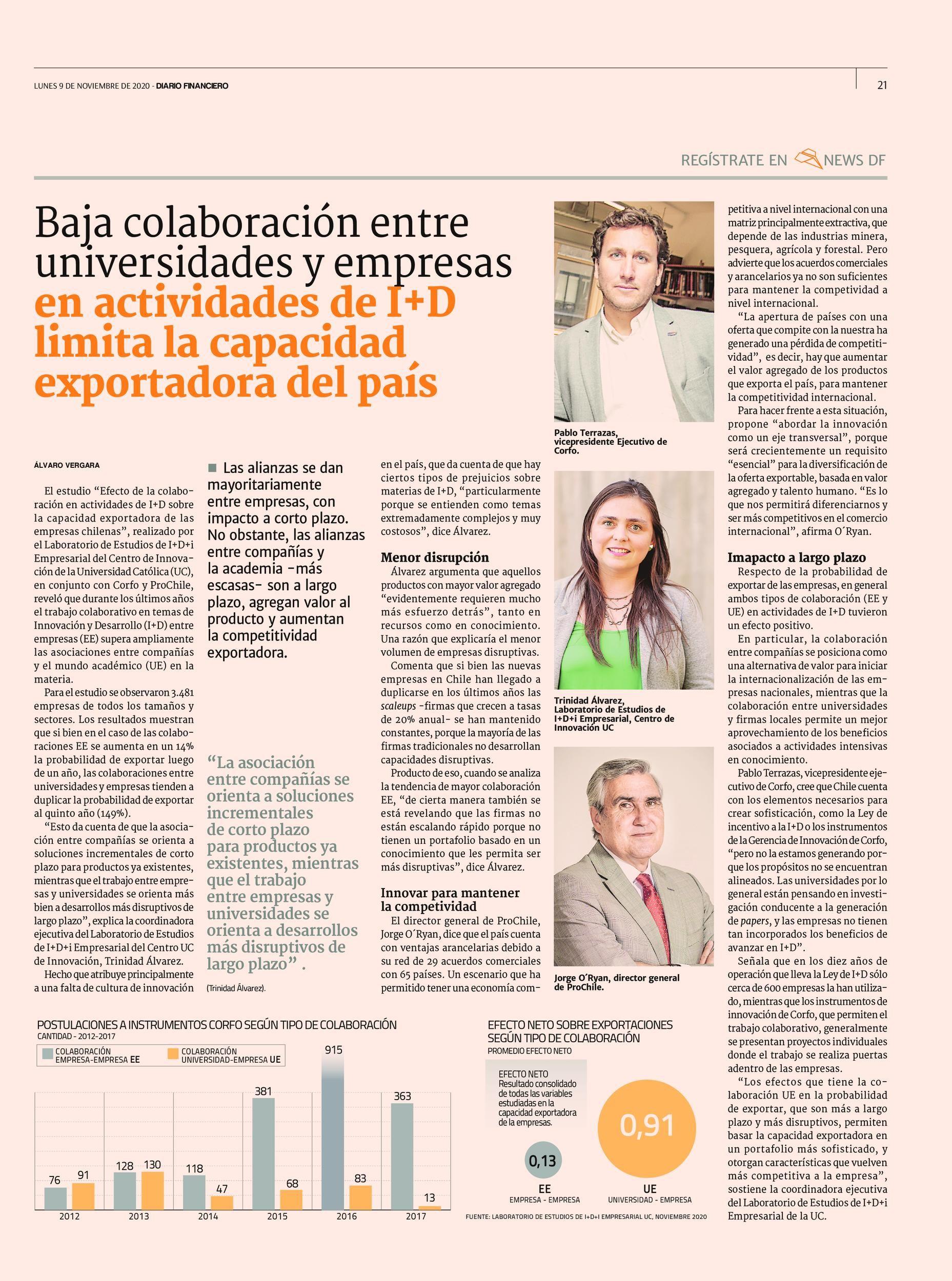 “Los efectos que tiene la colaboración UE en la probabilidad de exportar, que son más a largo plazo y más disruptivos, permiten basar la capacidad exportadora en un portafolio más sofisticado, y otorgan características que vuelven más competitiva a la empresa”, sostiene la coordinadora ejecutiva del Laboratorio de Estudios de I+D+i Empresarial de la UC.