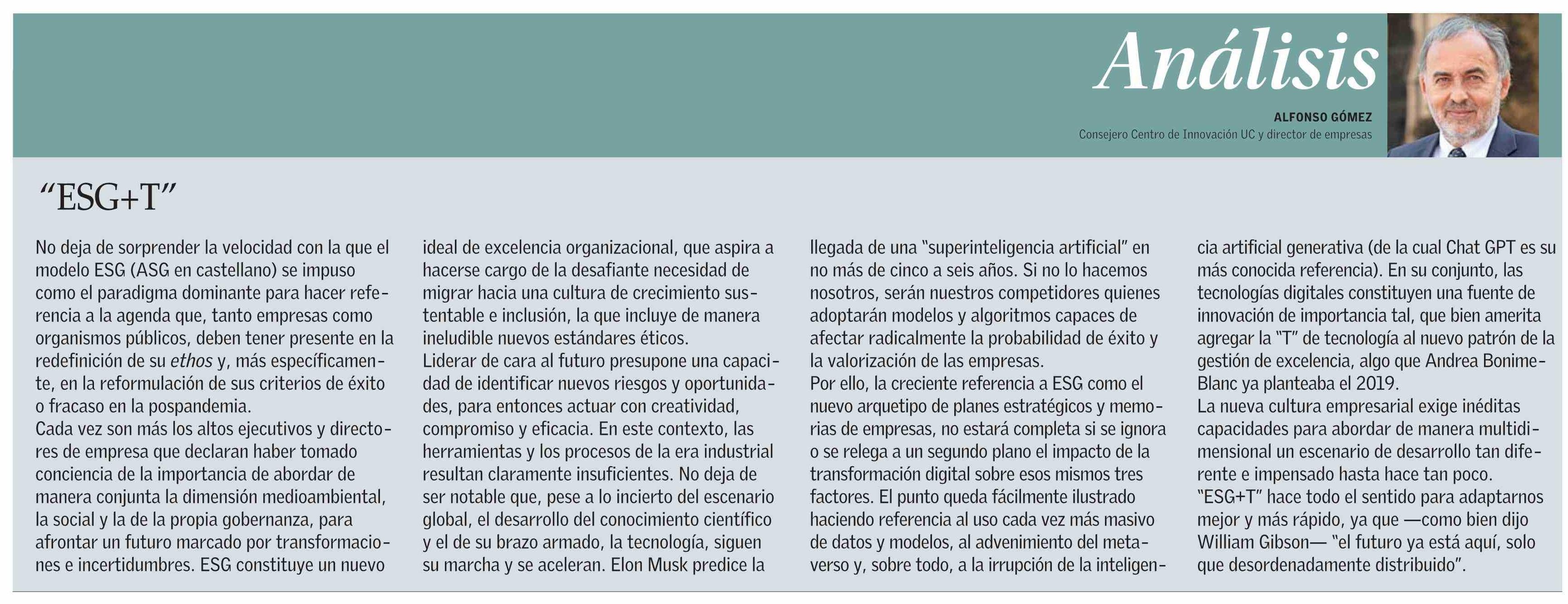 Por ello, la creciente referencia a ESG como el nuevo arquetipo de planes estratégicos y memorias de empresas, no estará completa si se ignora o se relega a un segundo plano el impacto de la transformación digital sobre esos mismos tres factores. El punto queda fácilmente ilustrado haciendo referencia al uso cada vez más masivo de datos y modelos, al advenimiento del metaverso y, sobre todo, a la irrupción de la inteligencia artificial generativa (de la cual Chat GPT es su más conocida referencia). En su conjunto, las tecnologías digitales constituyen una fuente de innovación de importancia tal, que bien amerita agregar la “T” de tecnología al nuevo patrón de la gestión de excelencia, algo que Andrea Bonime-Blanc ya planteaba el 2019.