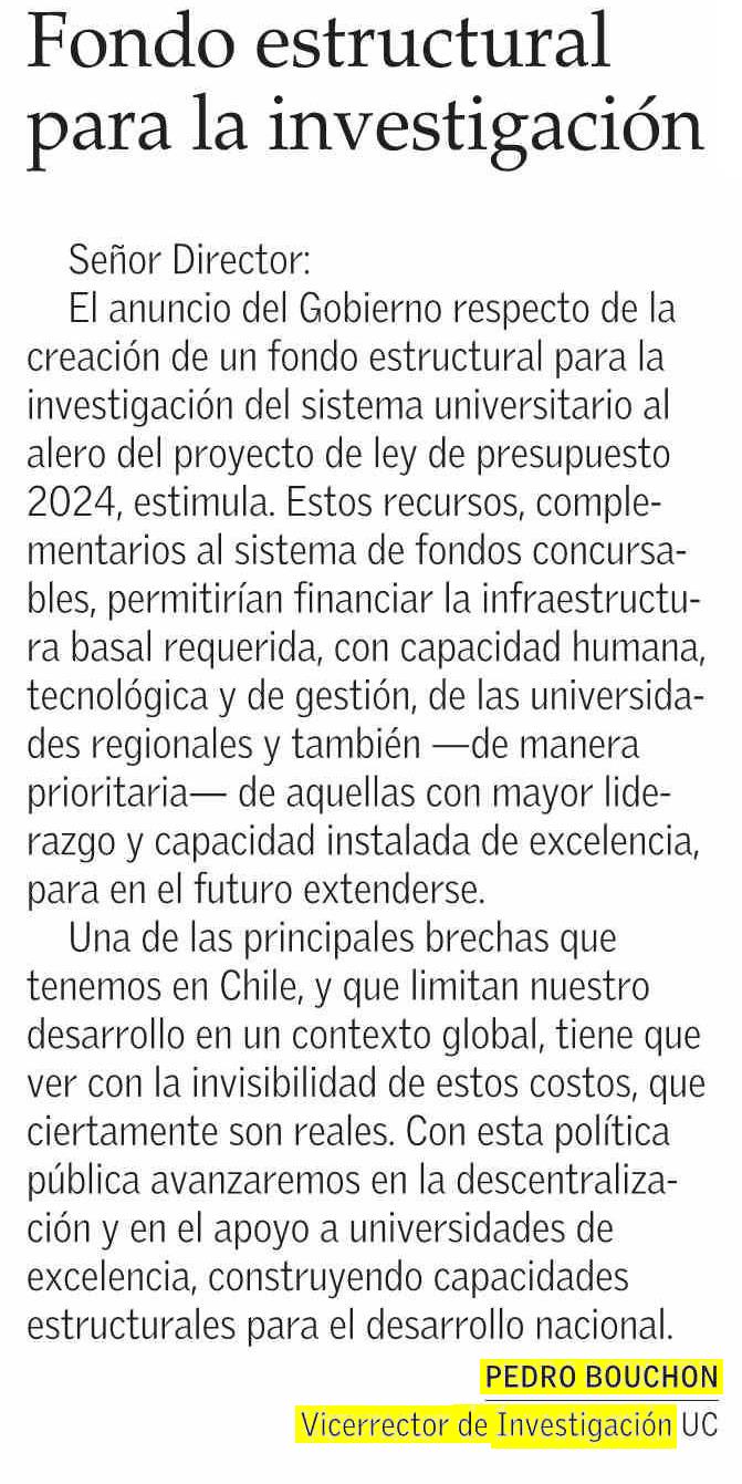 Señor Director: El anuncio del Gobierno respecto de la creación de un fondo estructural para la investigación del sistema universitario al alero del proyecto de ley de presupuesto 2024, estimula.